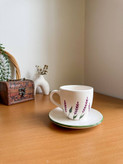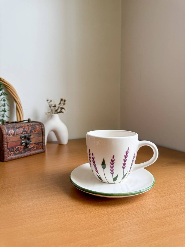 این محصول فنجان سرامیکی با طرح گل بنفشه است که نقاشی آن کاملا با دست کشیده شده است.
