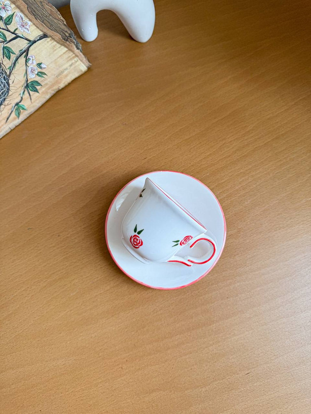 این محصول فنجان سرامیکی قهوه خوری با طرح رز قرمز است که نقاشی آن کاملا با دست کشیده شده است و دور تا دور فنجان نقاشی کشیده شده است.