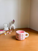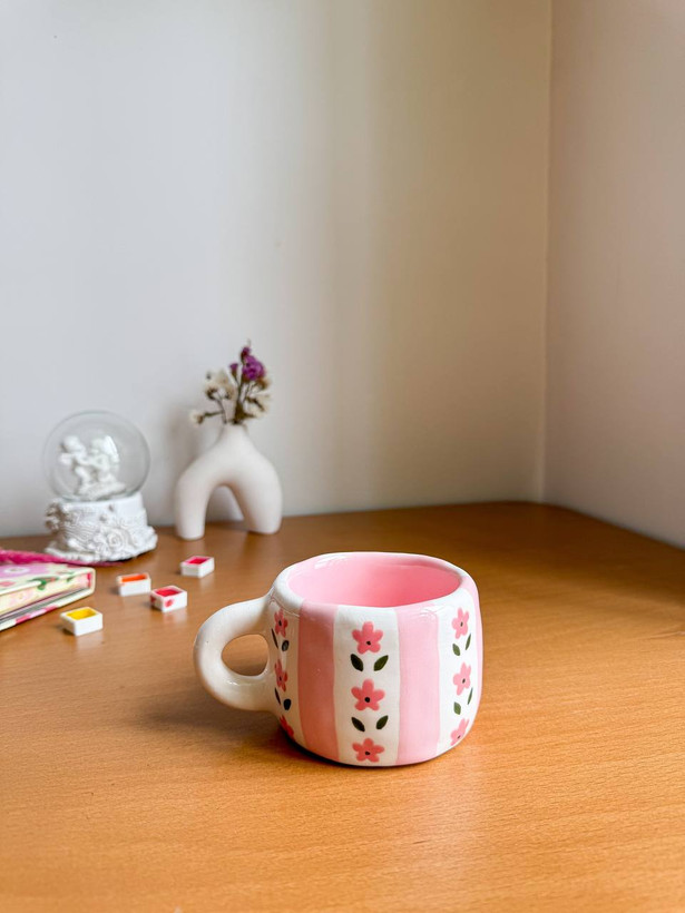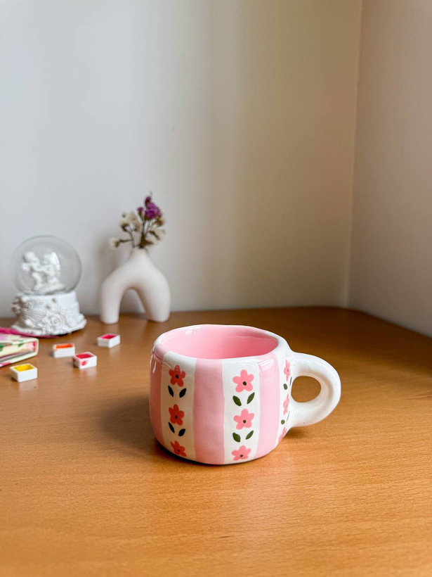 این محصول ماگ سرامیکی دستساز با طرح راه راه و گل گلی صورتی است که نقاشی آن کاملا با دست کشیده شده است.